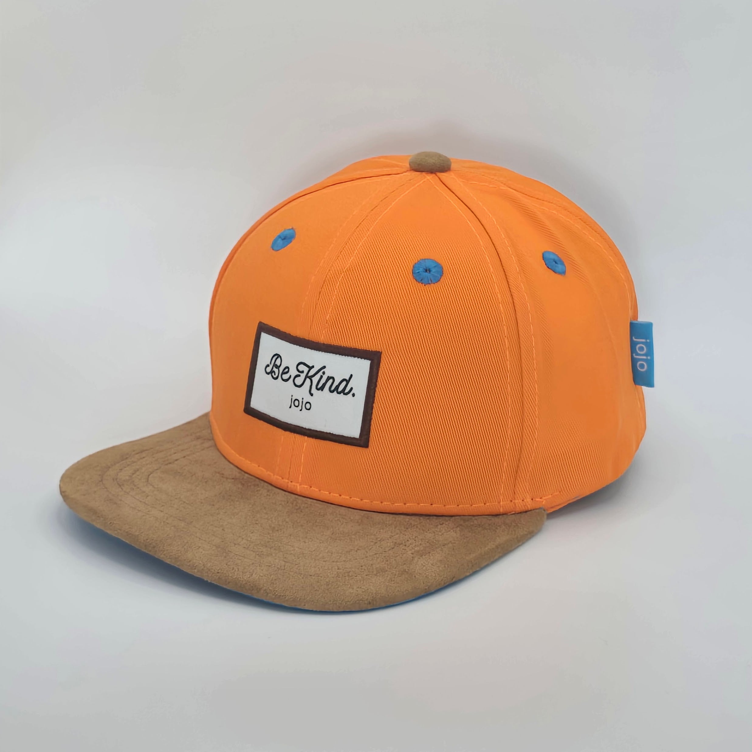 Say hey to Orange — the cap that’s as loud and lively as your little legend. With a juicy bright orange crown, sky-blue eyelets, and a sneaky flash of electric blue under the brim, this one’s built to stand out. The soft caramel suede-style peak brings the cool contrast, while our bold Be Kind patch keeps the vibes on point. Whether they’re tearing up the playground or cruising the skatepark, this cap’s got serious energy. Made by Jojo — for kids who bring the sunshine and the swagger.